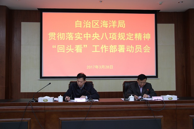为贯彻落实自治区党委和自治区纪委关于在全区开展贯彻落实中央八项规定精神“回头看”工作,3月28日,自治区海洋局召开贯彻落实中央八项规定精神“回头看”工作部署动员会。局党组书记、局长张创智,局党组成员、副局长张光忠出席了会议。