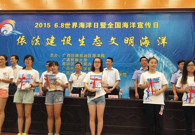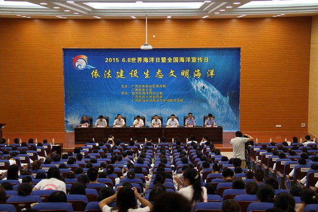 6月8日是世界海洋日暨全国海洋宣传日。广西壮族自治区海洋局与广西民族大学联合举办 “海洋知识进校园”系列活动,在广西民族大学校园顺利举行。该活动由广西壮族自治区办公室、广西民族大学校团委、广西民族大学海洋与生物技术学院承办,旨在呼吁大家共同关心海洋、保护海洋、爱护海洋,为使我国建设成为海洋强国以及依法建设文明生态海洋做出贡献。本次系列活动有海洋知识主题宣讲、海洋主题电影周、海洋文化知识竞赛、“依法建设生态海洋文明”主题板报展等。 6月8日上午在“海洋知识进校园”宣讲活动现场广西民族大学党委副书记宁耀,自治区海洋局党组成员、副局长张光忠先后致辞。 为了让同学们更加了解海洋,全面掌握海洋的文化知识,与会领导向学生赠送《我们的海洋》系列书籍,并在现场与全场师生庄严承诺“我们承诺,我们将携起手来,关注海洋、宣传海洋、善待海洋、呵护海洋,致力共创绿色生态文明,共建蓝色和谐家园,共享幸福美好生活! ” 宁耀希望以此次活动为契机,加强与广西壮族自治区海洋局的合作交流,校局联合、强强联手,把握机遇、加快发展,一起办好世界海洋日暨全国海洋宣传日系列活动,一起做好广西海洋事业人才培养工作,共同推进广西海洋事业的蓬勃发展,形成关心海洋发展、参与海洋环保、支持海洋事业的良好局面,推动全社会共同关注海洋、爱护海洋、保护海洋。 张光忠表示,近年来广西海洋事业迎来了大发展的机遇,同时我区海洋开发利用与环境保护面临的新挑战也不断涌现,广西海洋综合管理部门坚持科学用海,依法治海,全力推进广西海洋生态文明建设。在第八个世界海洋日暨全国海洋宣传日到来之际,按照习近平总书记的指示要“进一步关心海洋、认识海洋、经略海洋,推动海洋强国建设不断取得新成就。”真诚地希望大家认识海洋、关心海洋、保护海洋、科学开发利用海洋能成为每一个人践行一生的行动。同时,诚挚邀请和欢迎青年朋友们加入到我们广西海洋事业的行列中来,我们共同努力为海洋事业的繁荣发展,为海洋经济领跑广西,创造更加辉煌的明天。 宣讲活动后,广西民族大学教授给学生们开展了一堂名为“海洋—人类生存的第二空间”海洋专题知识讲座,与会代表参观“依法建设生态文明海洋”宣传板报设计展,并向在场学生们发放海洋科普小册子,通过各种形式向学生们生动展示了海洋各个方面的科普知识,宣传了海洋灾害来临时的避灾避险基本常识,得到了广大在校师生的积极响应。