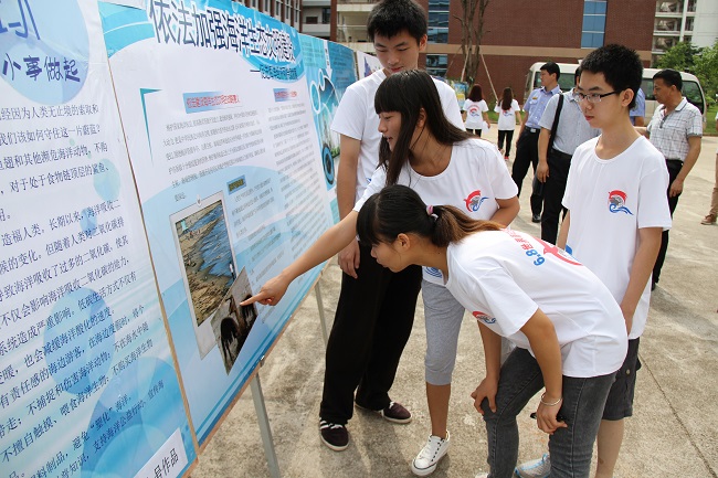 学生们观看海洋知识板报设计展