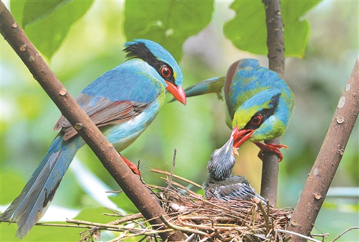 ③在广西弄岗国家级自然保护区,印支绿鹊正在喂养雏鸟。张小宁/摄