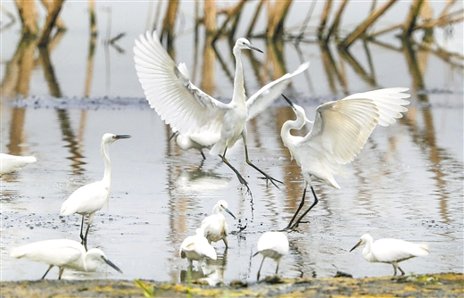 ②南宁市心圩江湿地上,白鹭一家正在觅食。 本报记者 周 军/摄