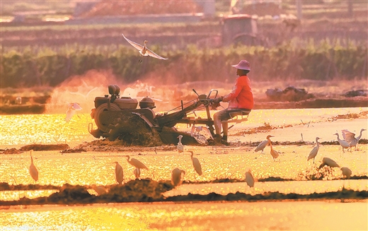 ⑤春耕时节,在百色市田阳区,白鹭在耕作后的水田里觅食。黄俊勇/摄