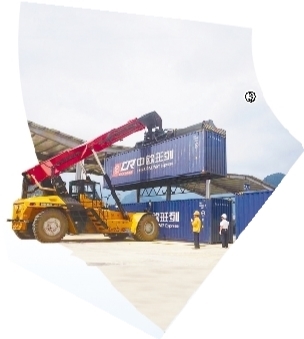 ③在国铁凭祥口岸物流中心,跨境班列(南宁—河内)集装箱装上火车。 谢世江/摄