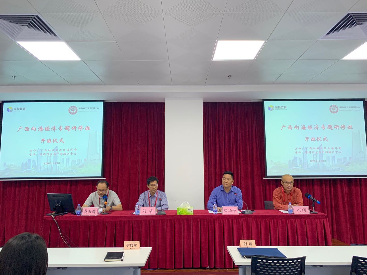 图为自治区海洋局副局长刘斌同志出席开班仪式并讲话,深圳市宣传干部培训中心主任徐华平同志致辞。