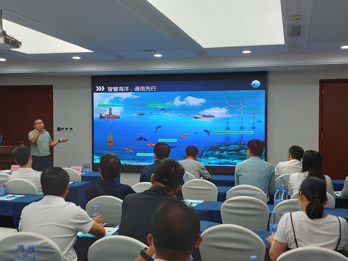 图为现场教学,参观深圳市智慧海洋科技有限公司,公司CEO陈学思做“智慧海洋、通信先行”讲解