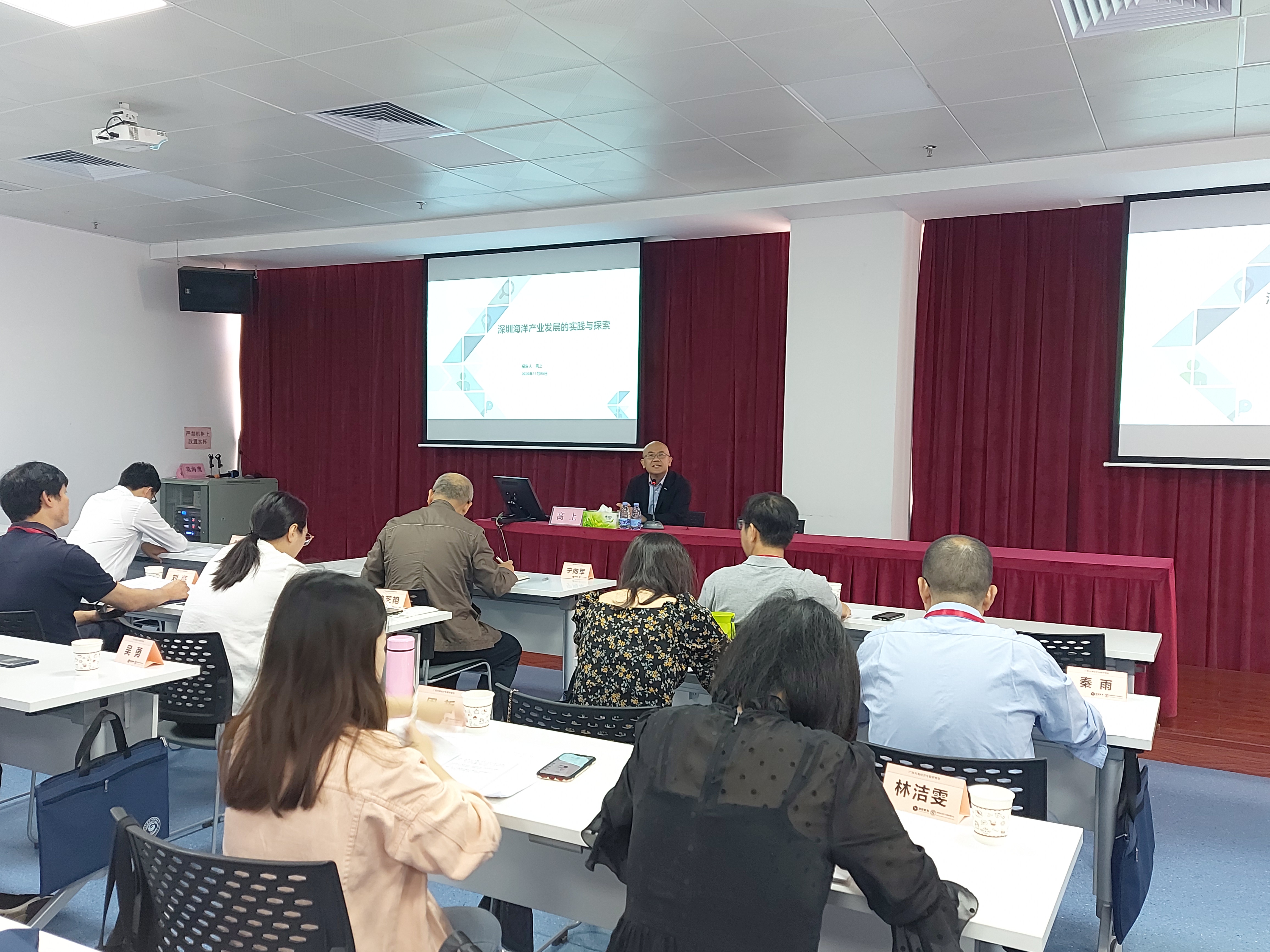 图为专题授课,中国深远海海洋工程装备技术产业联盟副秘书长,深圳市海洋协会副会长、中国国际海运集装箱(集团)股份有限公司首席战略师高上做《深圳海洋产业发展的实践与探索》专题讲座