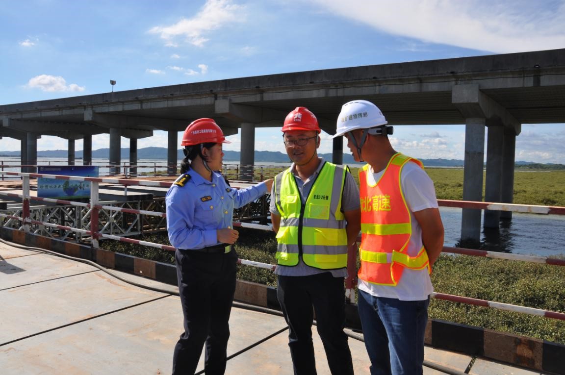 图为执法人员与用海项目施工方、业主方了解情况(安玥莹/摄)