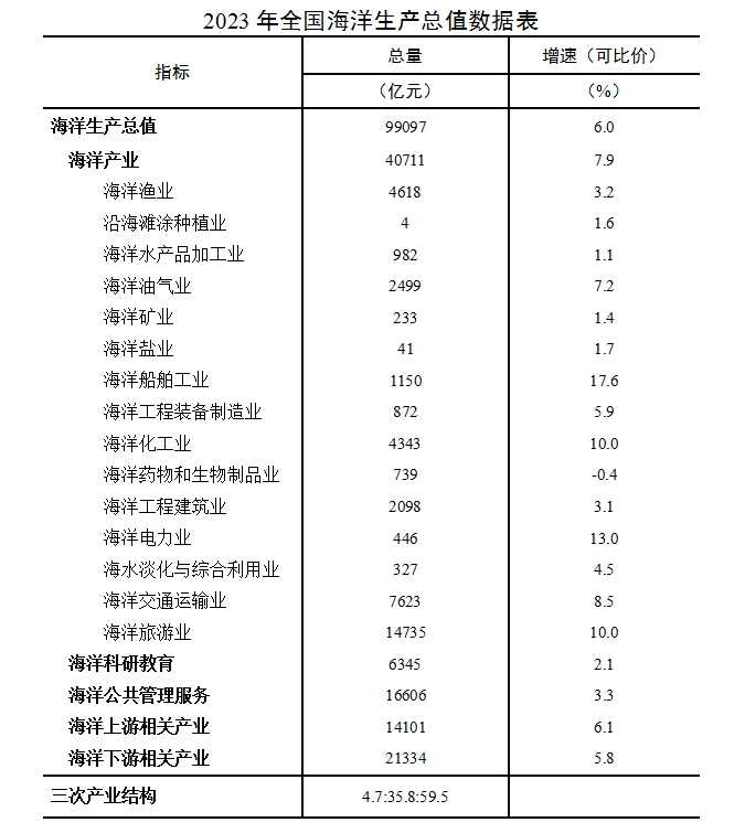 2023年,全国海洋生产总值99097亿元,比上年增长6.0%,增速比国内生产总值高0.8个百分点;占国内生产总值比重为7.9%,比上年增加0.1个百分点。 从三次产业看,海洋第一产业增加值4622亿元,第二产业增加值35506亿元,第三产业增加值58968亿元,分别占海洋生产总值的4.7%、35.8%和59.5%。 从内部结构看,海洋产业增加值为40711亿元,同比增长7.9%;海洋科研教育6345亿元,同比增长2.1%;海洋公共管理服务16606亿元,同比增长3.3%;海洋上游相关产业14101亿元,同比增长6.1%;海洋下游相关产业21334亿元,同比增长5.8%。