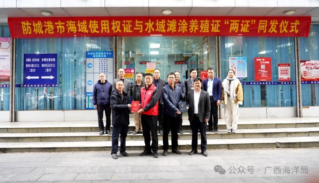 12月27日,防城港市有关部门为防城区茅岭镇美丽村开放式养殖用海项目同时制发海域使用权证、水域滩涂养殖证,我区首次顺利实现“两证同发”,进一步提升养殖用海保障效率,为广西沿海地区优化养殖用海管理供了可复制可借鉴可推广的经验。