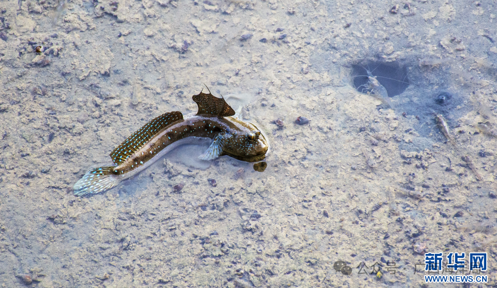 这是北海市金海湾红树林生态旅游区一角。弹涂鱼可谓滩涂上的“全能选手”。它们水陆两栖,既会钻洞、游泳,又能在地面跳跃,甚至擅长爬树,因此也得了一个活泼的别名——“跳跳鱼”。