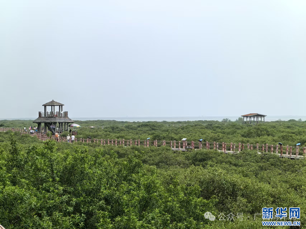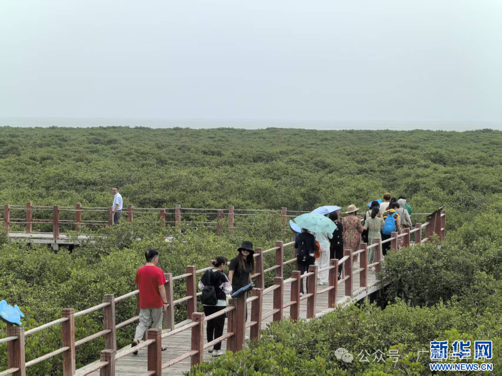 游客在北海市金海湾红树林生态旅游区观光。从弹涂鱼欢跃的滩涂,到百姓致富的“绿色银行”,广西北海的金海湾红树林生动诠释了“绿水青山就是金山银山”的实践路径。随着保护体系的持续完善与生态价值的深度转化,这片扎根于海水之间的绿意,将继续书写生态保护与绿色发展交织的动人篇章,让“跳跳鱼”与“海上森林”的故事,永远生机盎然。