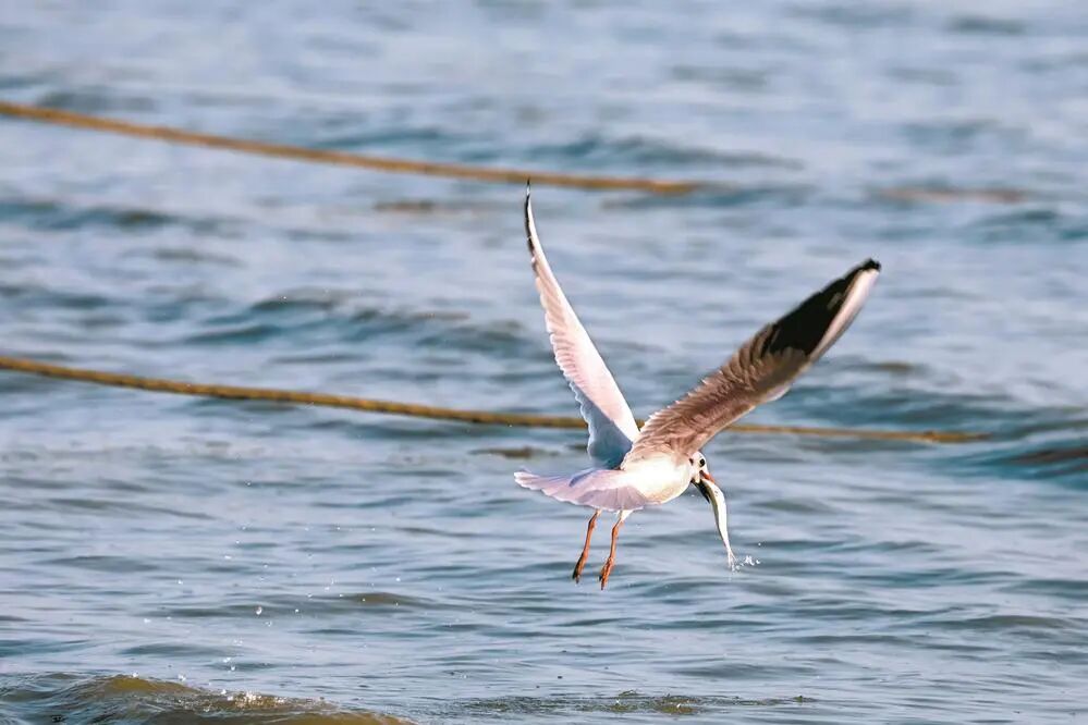 一只海鸥“捕获”游客投喂的小鱼。