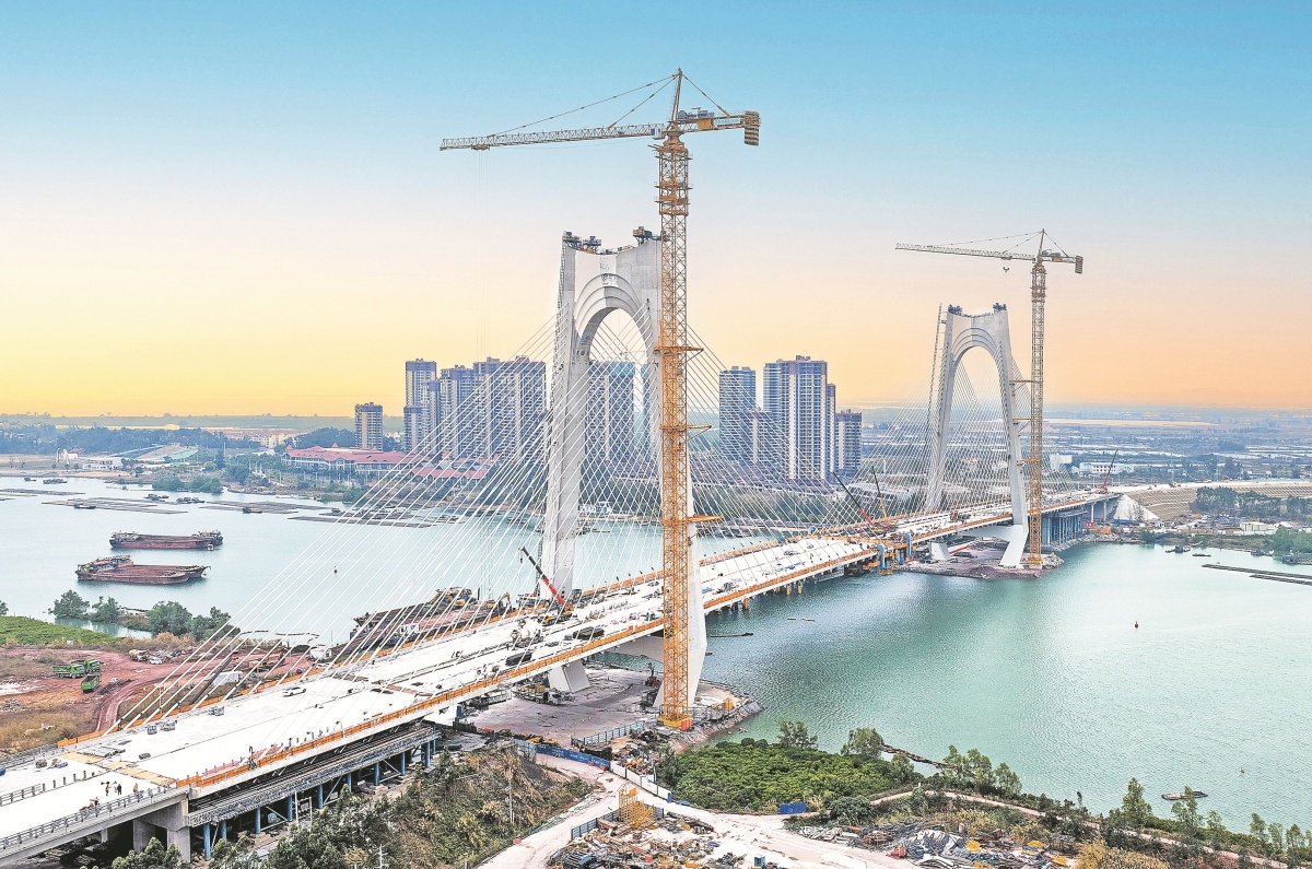 1月27日,在平陆运河沙井钦江大桥,工人们在做最后的合龙准备。该桥是钦江与茅尾海分界的标志桥梁,主跨270米,主桥箱梁采用混凝土分离式双边箱断面,共分为87个梁段。记者 周军 摄