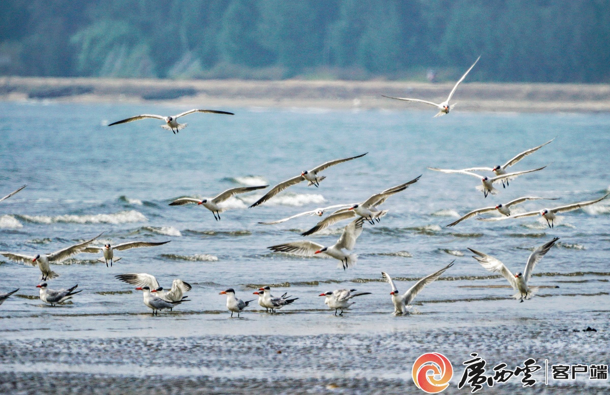 在防城港市港口区企沙镇山心沙岛海滩上自由飞翔的红嘴鸥。广西云-广西日报记者 周军 摄(资料图)