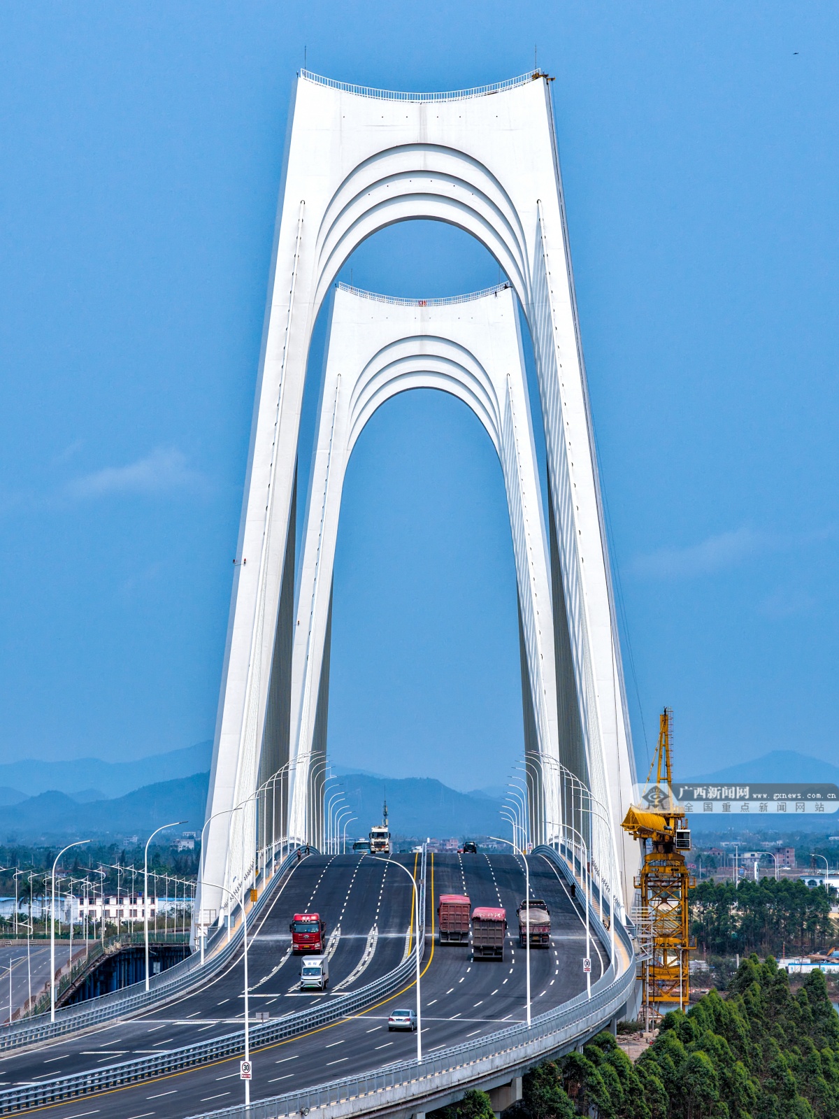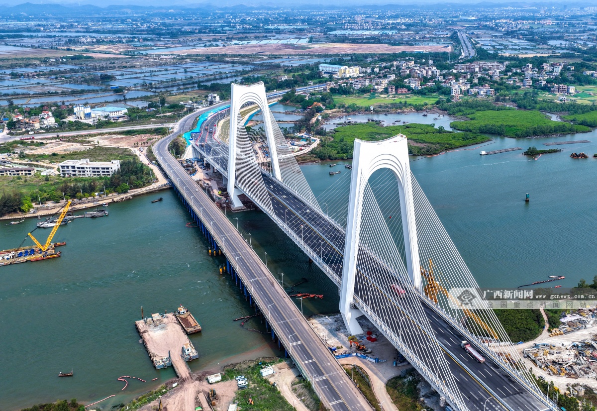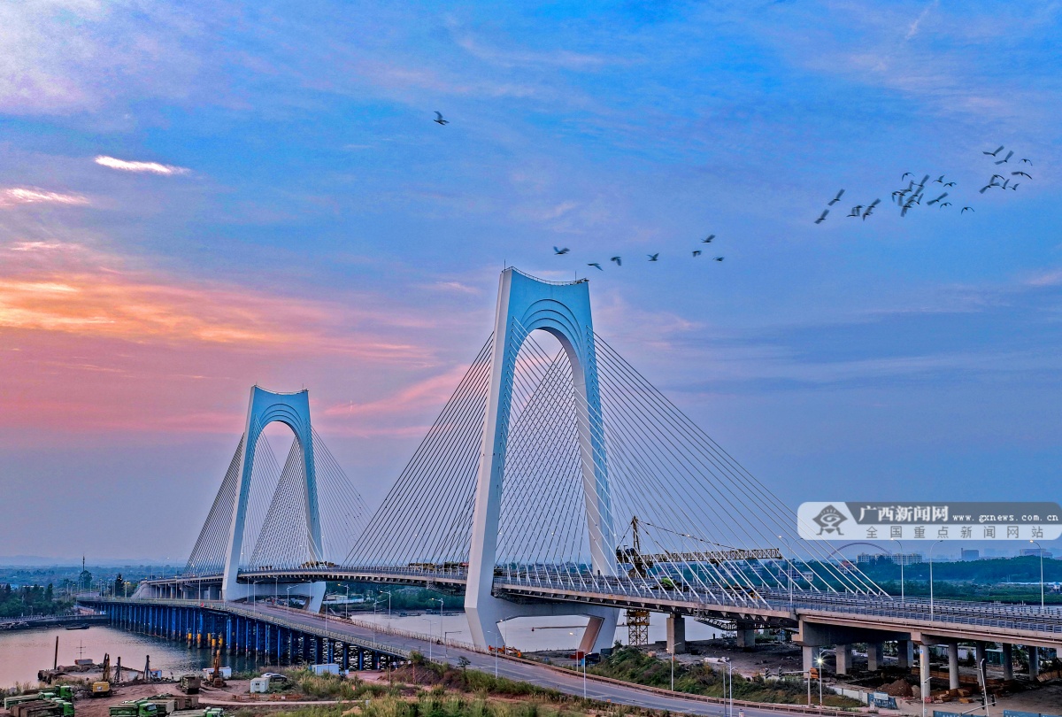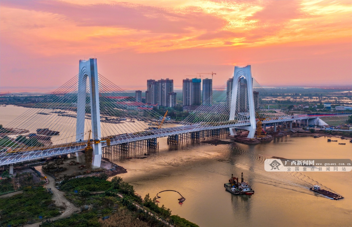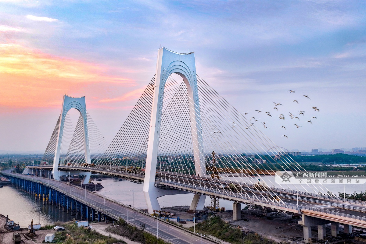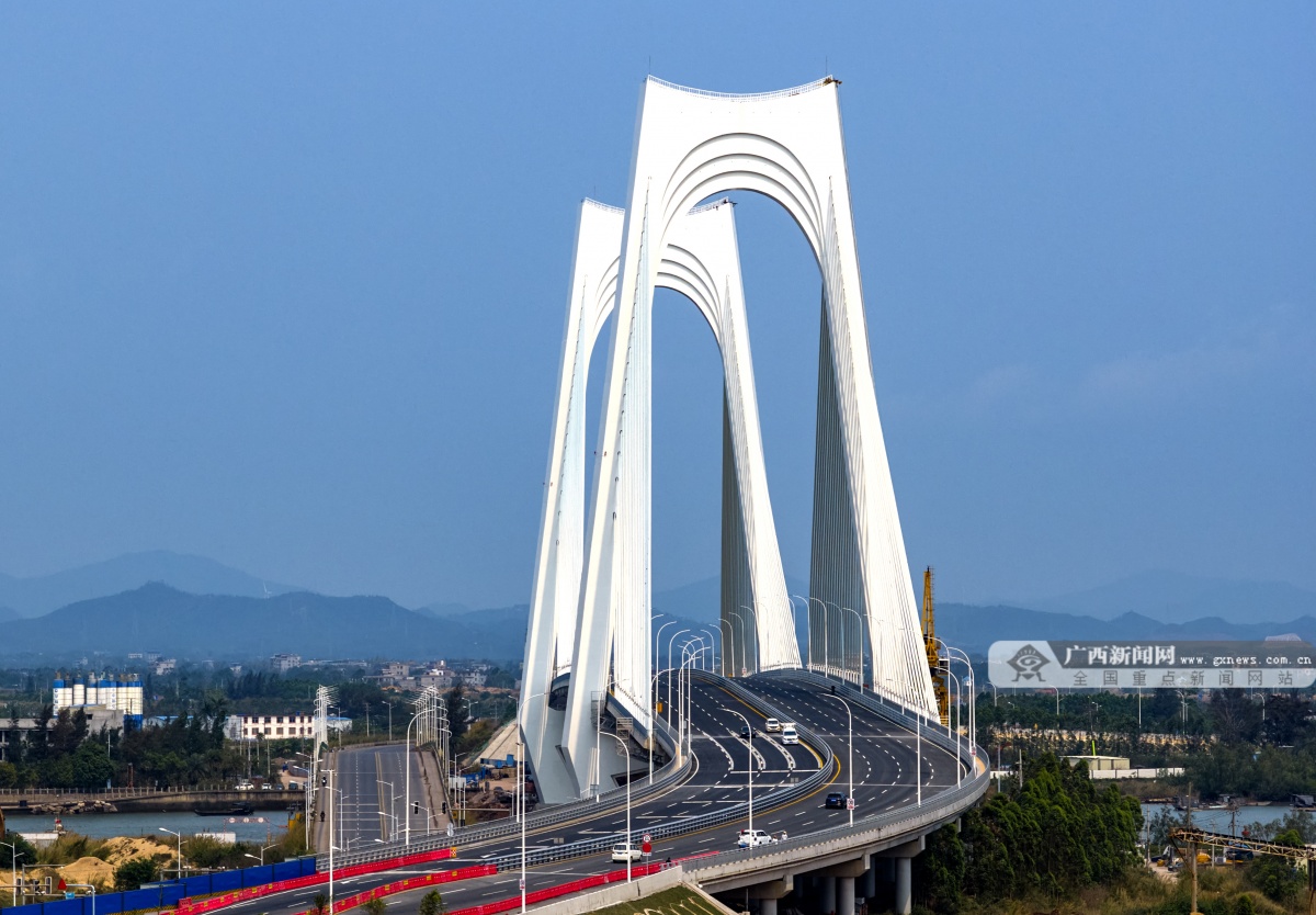 该桥采用双塔斜拉桥设计,主塔采用“门”式索塔,塔柱高113米。桥塔上横梁整体造型抽象于巨轮出海激起的滔滔波浪,打造出扬帆远航的“门户”形象,并巧妙融合了“大门”与“醒狮”的双重文化意象,在现代工程的简洁线条中,生动注入了吉祥兴旺的岭南意蕴。该桥全长896米、主跨270米,大桥设计时速60公里,桥面宽40米,采用双向8车道,结构安全等级一级,通航净高19.1米、通航净宽234米,可满足运河5000吨级船舶安全通航需求。截至目前,平陆运河规划的27座跨线桥梁中,已有25座桥梁建成通车,全线桥梁工程即将收官,为平陆运河全线通航奠定了坚实基础。
