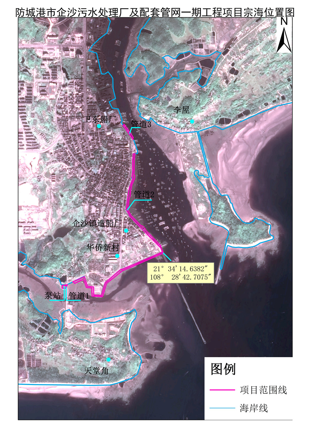 防城港市市政管理局向我局申请位于防城港企沙镇华侨新村东南侧海域的4.1032公顷海域(位置坐标为:①108°28′06.7574"~108°28′32.7791"E, 21°34′03.0920"~ 21°34′47.4933"N),用于防城港市企沙镇污水处理厂及配套管网一期工程项目建设,项目申请用海类型为造地工程用海、海底工程用海,用海方式为海底电缆管道、建设填海造地(其中海底电缆管道3.994公顷、建设填海造地0.1092公顷),申请用海年限40年。根据《广西壮族自治区海域使用管理条例》规定,现将该项目用海情况予以公示,如有异议者,请在公示之日起二十日内向我局提出书面意见。如无异议,我局将按有关规定办理用海手续。