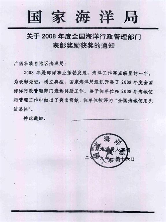 关于2008年度全国海洋行政管理部门表彰奖励获奖的通知